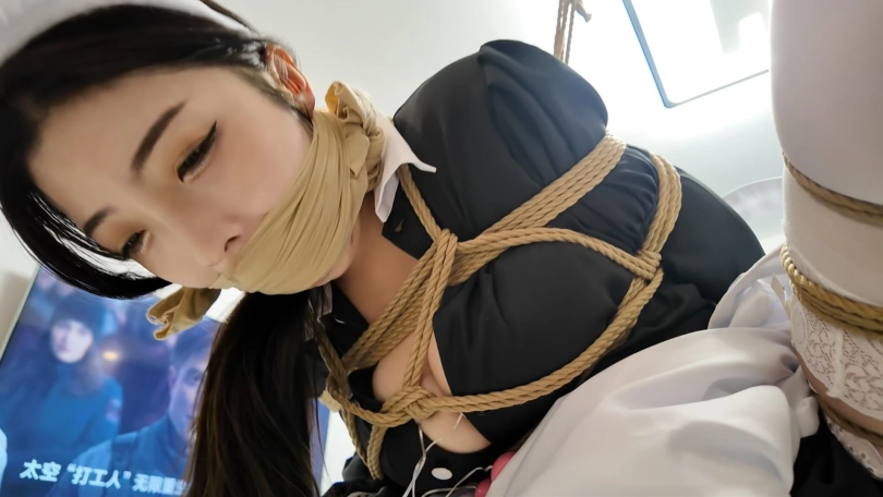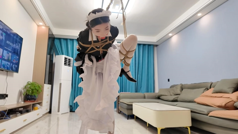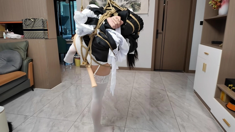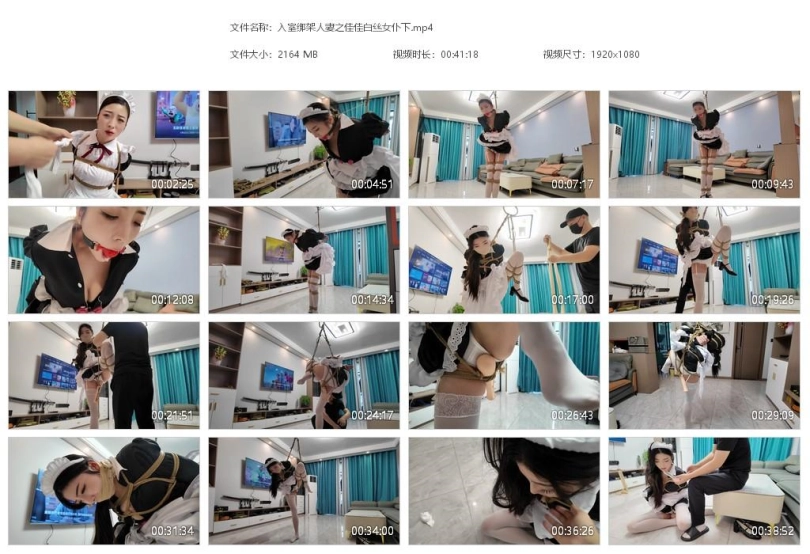 男子将绑架来的人妻装箱带走。回到家后开箱,经过一个月短暂的调教,佳佳暂时成为男子家中的女仆。不过这只桀骜不驯的小野猫似乎不太好训,于是男子借佳佳摔碎碗的契机,再次展开调教。他将佳佳绑好在客厅中,假装要离开。佳佳见机会难得,于是便努力挣扎,试图去到窗边呼救。就在佳佳快到窗边时,男子一把抓住佳佳,把她从希望的边缘一把拉了回去进一步调教。接着男子在客厅中吊起佳佳后手,给她戴上口球并且用绳子拉起口球带,强迫她抬起头,然后拉起裙子绑上股绳再扒开佳佳胸前的衣服,往两胸各塞入一颗[X_X]。只见佳佳被[X_X]刺激得口水直流站立不安,下身又被股绳勒住,只能不停地发出呜呜声祈求男子放过她。再往后,男子决心一步到位,接着将佳佳绑成个单腿吊缚,并且在下身加上个棒棒,两胸前的蛋也调至最高档,就这样,将佳佳调教至几近虚脱。最终,桀骜不驯的野猫终于被驯服,含住了象征屈辱和臣服的水晶柱,就这样佳佳调教成功,正式成为了男子家的奴隶女仆。吊后手和单腿吊缚。带上口球后佳佳流的口水是真的多啊,地上一滩一摊的,加上tiao蛋后明显刺激得有感觉了。到后面单腿吊缚的时候,专门让老哥下面固定上了棒棒,上面俩蛋也调高档位,给佳佳刺激得不行了,最后差点虚脱。