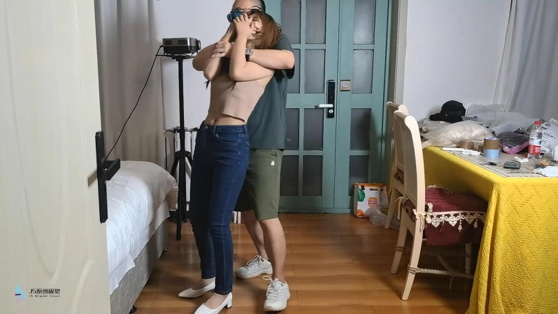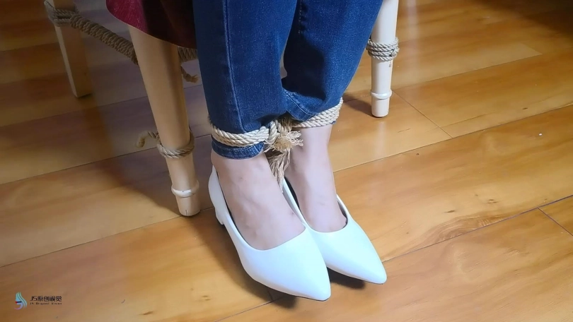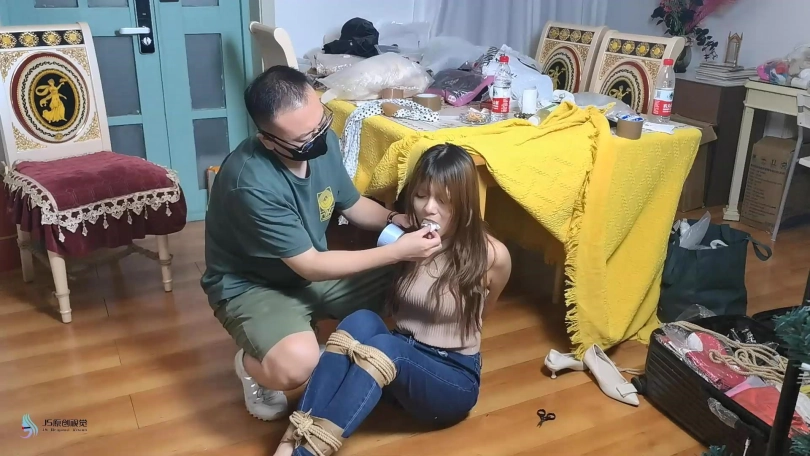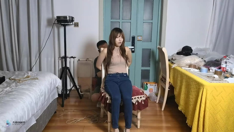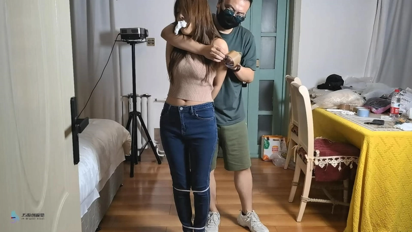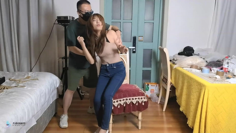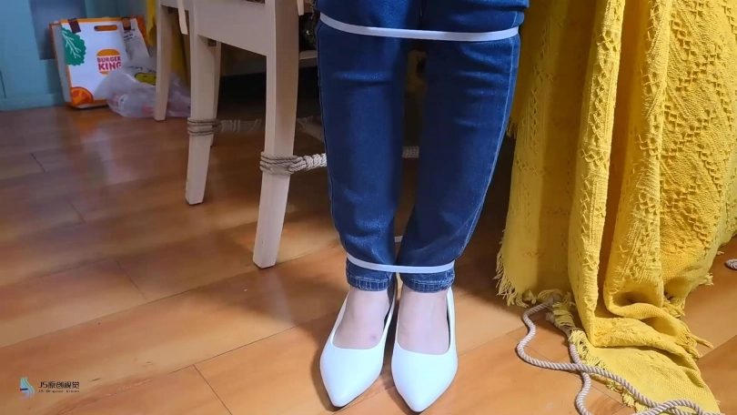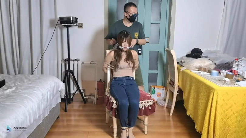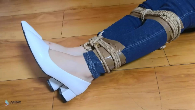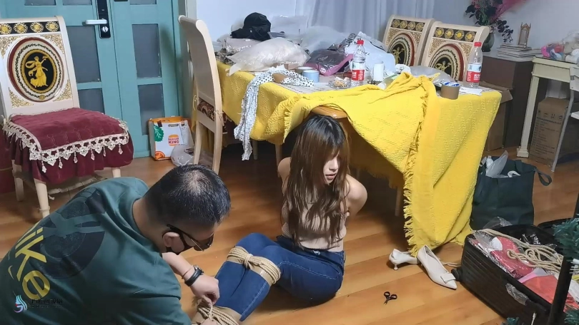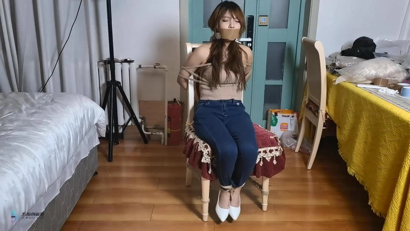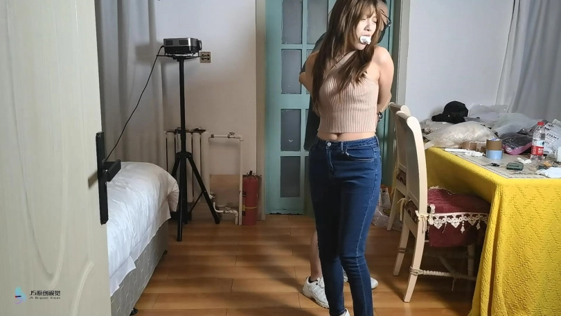 女孩在屋子里走来走去,嘴巴被塞住了(直接胶带封嘴吧)。绑匪用拉链把她的手绑在背后,绑住她的脚和膝盖。然后他用胶带把她的嘴粘起来。她挣扎着跳来跳去,在桌子上发现了剪刀。她设法用它来解放自己。当她准备逃跑时,她又被绑匪抓住了。绑匪把她带到一把椅子上,开始用绳子把她的手绑在椅子后面。她一直在挣扎,但没有用。他把她的腿绑起来,把她的手腕和腿绑在椅子的底座上。然后他用裂口堵住了她的嘴。然后他用胶带把它贴在裂口上(原点布勒嘴,外面贴胶带)。她只能苦苦挣扎。经过1分钟或2分钟的挣扎,她设法逃脱。她还没走出门就又被抓住了。绑匪对她的逃跑很生气。绑匪用胶带把她的手绑在桌腿后面(胶带包手吧),然后把绳子绑在胶带上。他对她的腿和膝盖做了同样的事。最后,他塞了一块布在她的嘴里,用胶带缠住她。她只能苦苦挣扎。