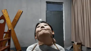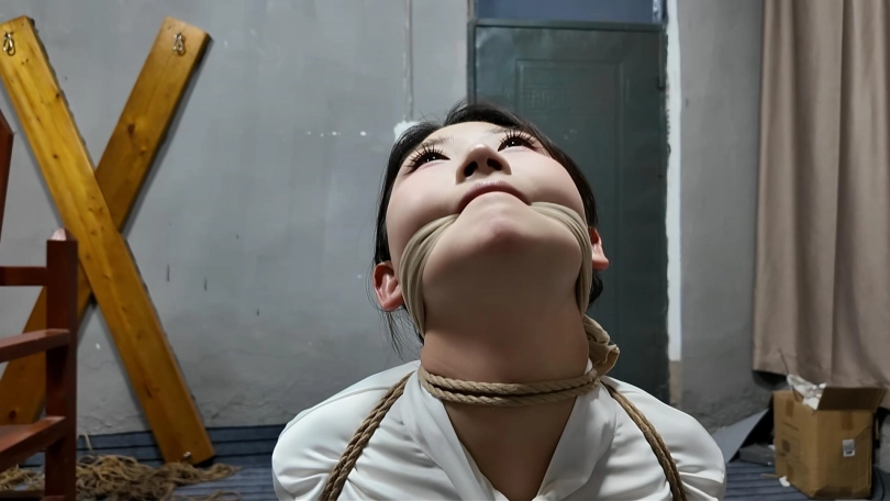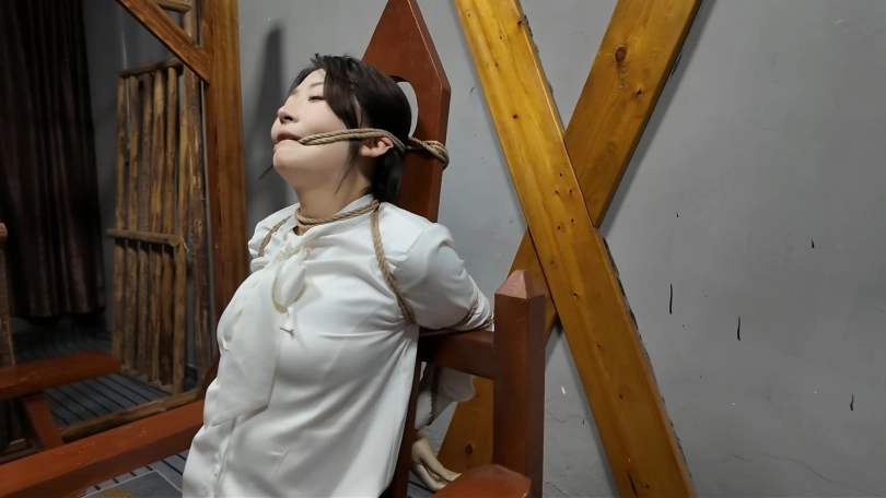 女朋友晓琴按要求被捆绑直臂,颈部勒紧,丝袜勒嘴,头只能仰着进到刑房,跪下接受调叫,绑到刑椅上面,脚趾绑上,后面手臂捆紧,继续勒嘴,下面固定棒棒,打开最大档位,让她在痛苦中快乐无边