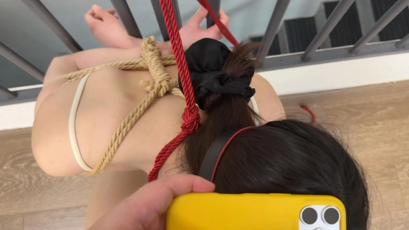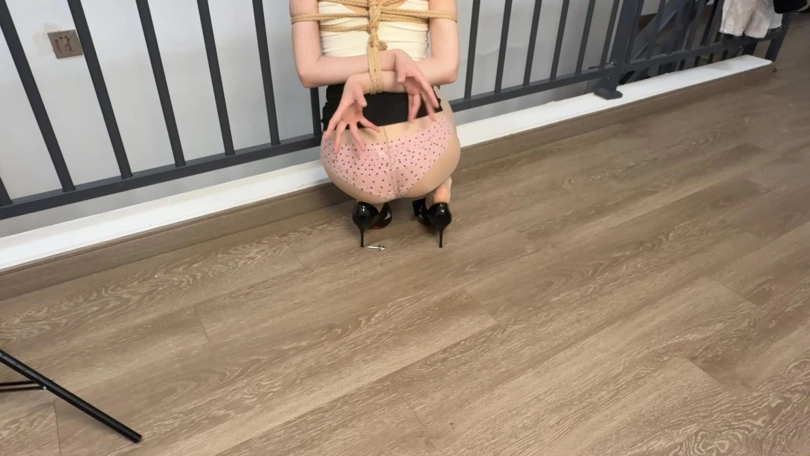 2:日式反绑,脖子被绳索绑在栏杆上只能半蹲着,并且穿着高跟鞋用胶带和脚缠在了一起,这样会更累,钥匙在离脚不远的地方,用高跟鞋够到,但实际上是拿不到手里的,因为脖子被锁在栏杆上,身体蹲不下来,这种给她希望却看不到希望,才是最致命的