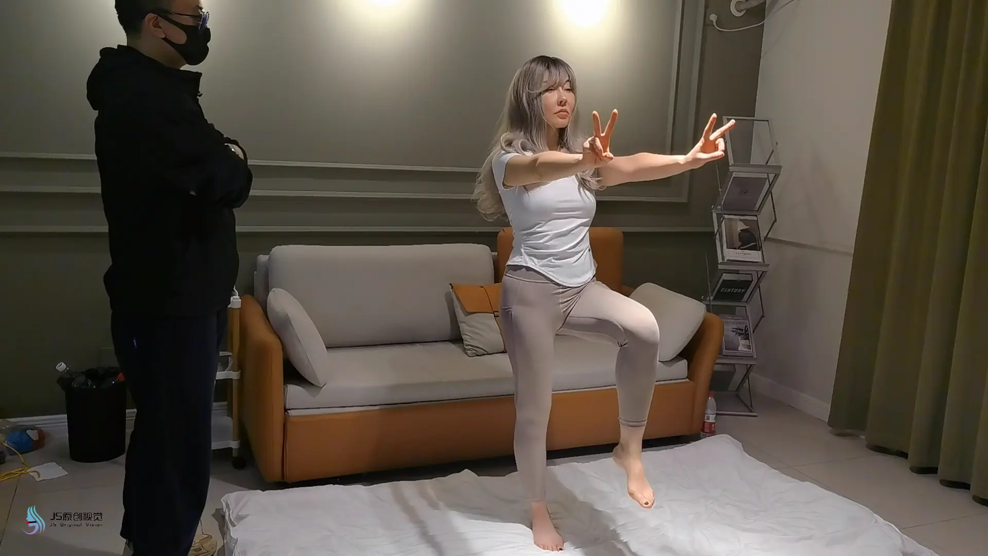 最后一幕,女主上身直立双腿跪在地上,两脚呈下图图示姿势,脚底露出来,两手比耶,面无表情,眼睛睁着,舌头吐出,像雕塑一样跪在屋子中间。镜头特写从女主脚开始向上一直到脸部(脚部和脸部停留时间可以稍长些,整个过程三分钟左右吧),最后给全身一个镜头然后逐渐拉远,结束。