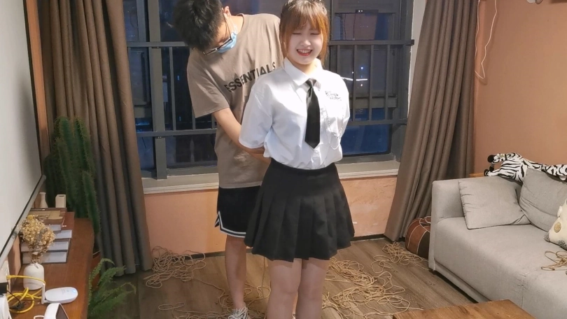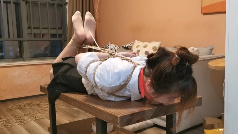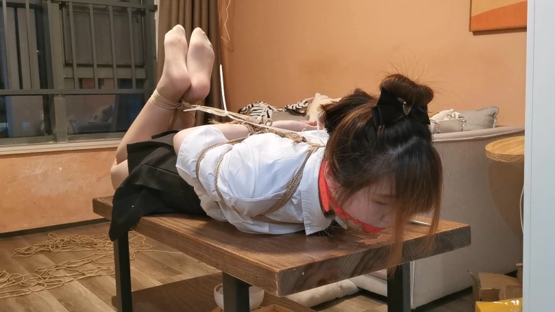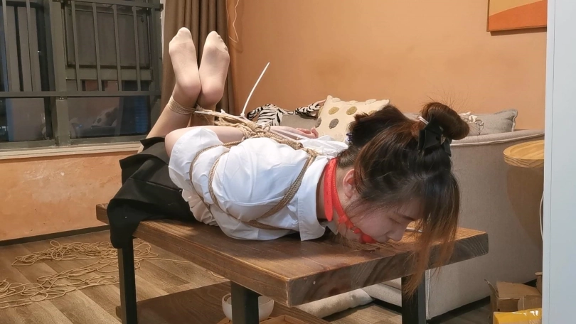 经典的JK制服,驷马放置在茶几上,并且这次用扎带拴住了口球向后拉让玥妍没办法把口球往外顶,最后茶几上的口水都流满了顺着边流下去了。