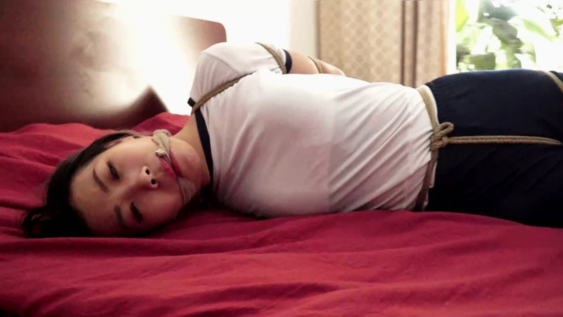 情节:美女林艺遭遇劫匪入室抢劫,被劫匪五花大绑口球塞嘴后坐在床上挣扎,劫匪收拾好财物,解开林艺嘴里的口球。