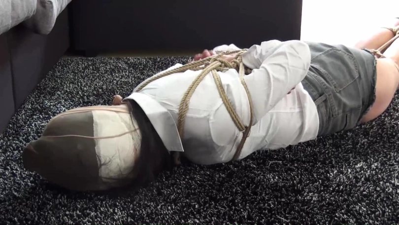 劫匪让笑笑坐好,拿绳索将其双腿与脚踝并拢捆绑结实,甚至还将笑笑脚面并拢捆绑了几道,最后,劫匪用一条肉色连裤丝袜套在笑笑头上,扬长而去。