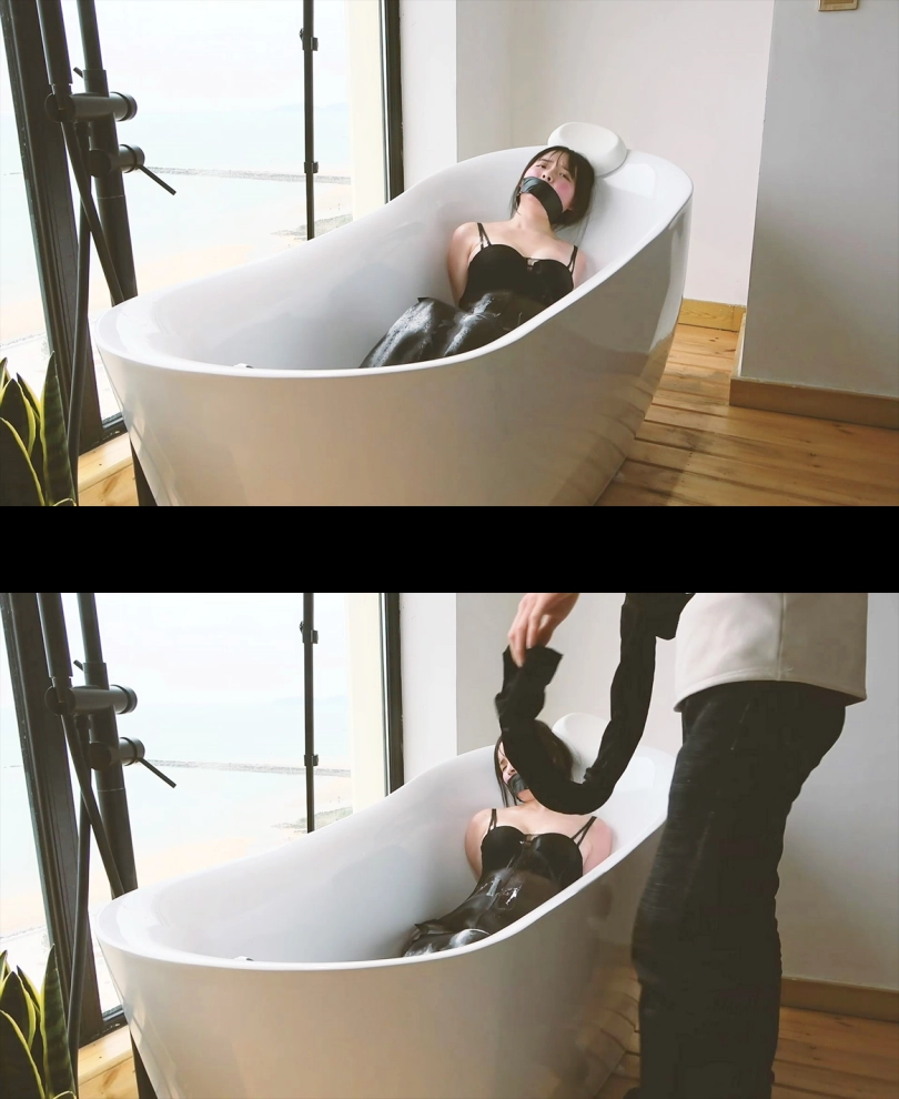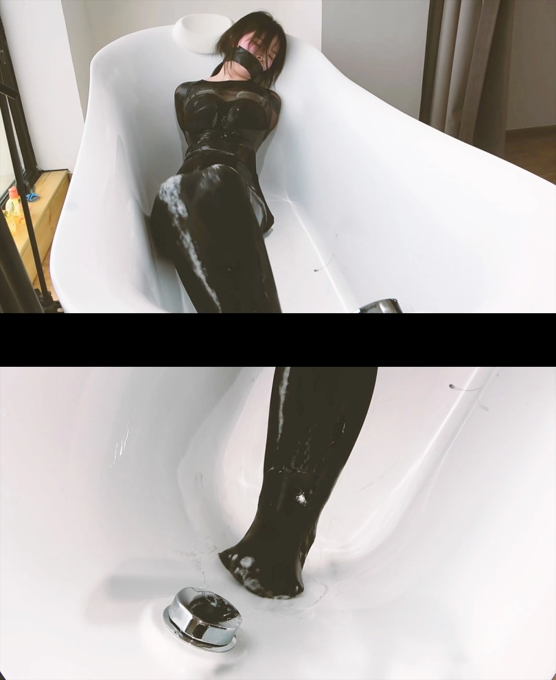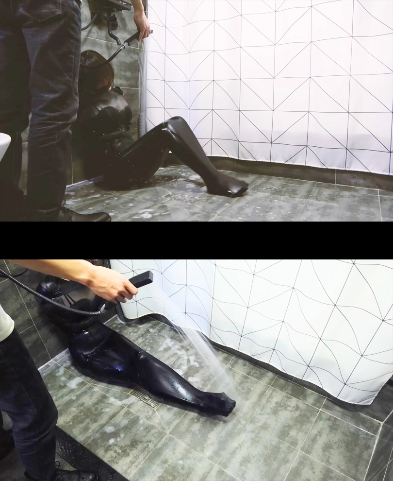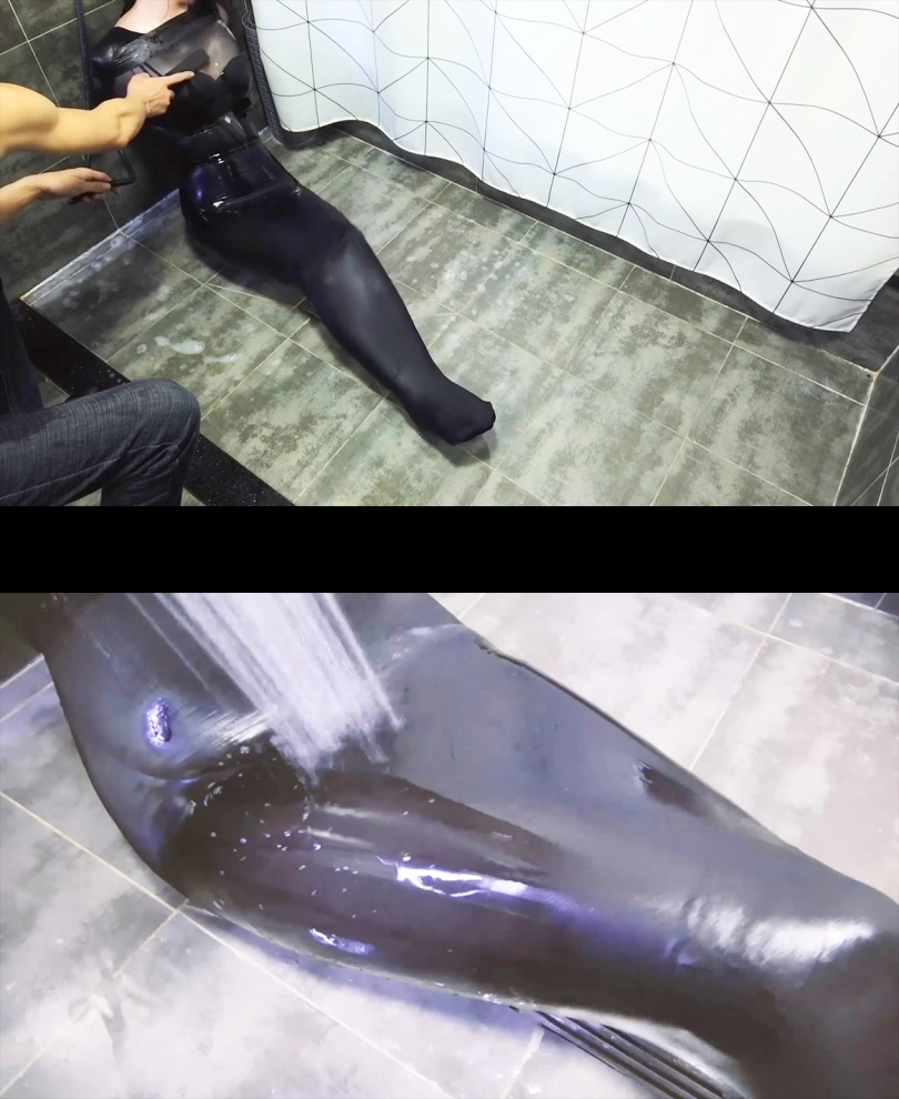 美女被黑丝套完全包裹,美女被包裹成丝袜茧,被男人用水冲美女敏感部位.