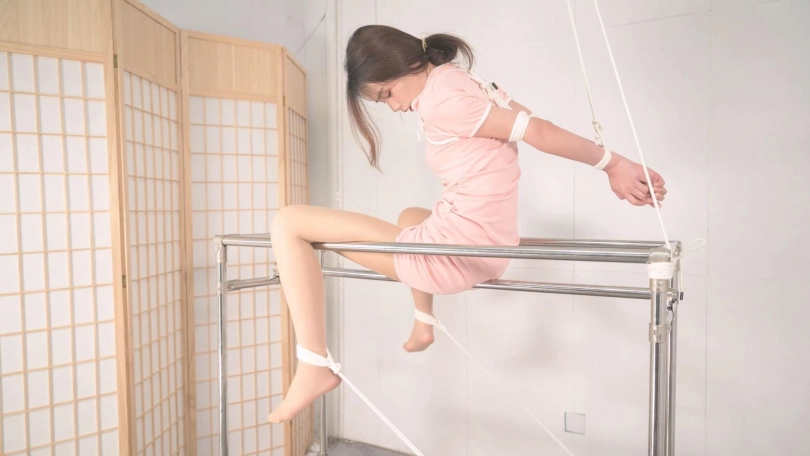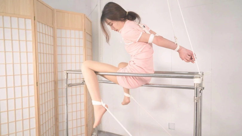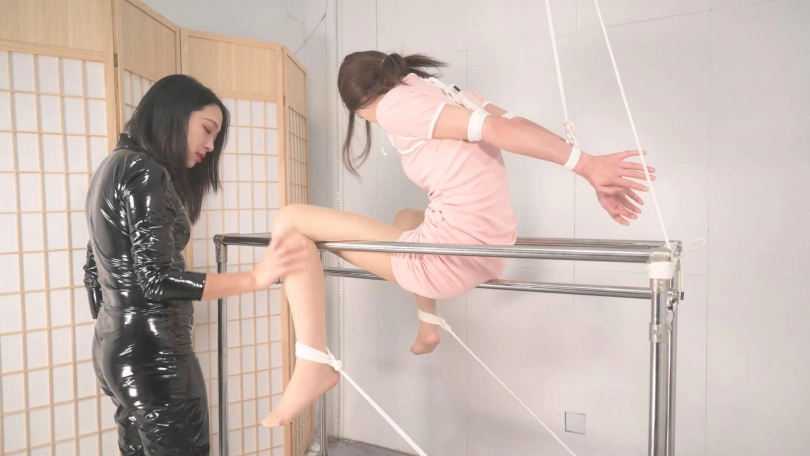 又是男女双S配合,言妍这次可惨了,本来设计是两腿搭在架子上分开,她表示胳膊受不了,那只能硬生生坐在了中间那根单杠上,顶着如此大的压力,女S沐小雨出场,她把刺轮玩明白了,还要在人家大腿上写字,这个道具看着不起眼,滚到身上非常疼,沐姐姐还不时用语言调教,这是本S的弱项。而且,沐姐的爱抚也是很带感,我看她的眼神都迷离了,看来她不止S、M双修,还是男女通吃吧,可怜了言妍坐在单杠上,还要不停遭受撩拨挠痒,反应也是相当撩人,本S也可腾出空来找角度,整个过程美不胜收。