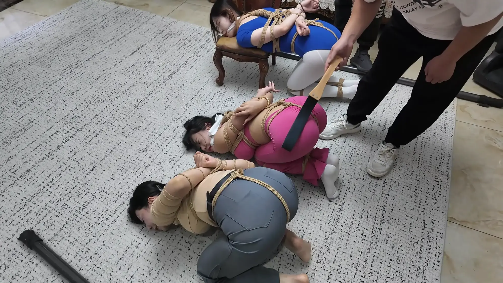 紧接第三集,三位美女被强制按在地上撅起屁股遭受皮鞭抽打,大哥玩累后交给小弟让他继续,小弟表示有更方便的姿势,于是他将e小姐、雷姐、南清探员三人屁股贴着屁股摆放好,继续用皮鞭抽打三人,三位美女痛苦的哀嚎着,大哥看着起劲把南清拉了起来,开始挑逗她并抽打脸部,另外两人继续被皮鞭抽打,大哥将南清转过身,强制她看着另外两人被折磨。过了一会儿,男人们将三人放倒在地驷马捆绑,开始挠脚心,并时不时拍打三人的屁股,接着e小姐被m字开腿绑在凳子上,雷姐与南清分别跪在e小姐的两侧,小弟用手强制她们闻e小姐的脚,并按住她们的头不停蹭e小姐的脚底,雷姐不敢受辱,抓住机会一口咬住了小弟,小弟痛得大叫,大哥上前将雷姐放倒在地,表示要狠狠教训她一顿。