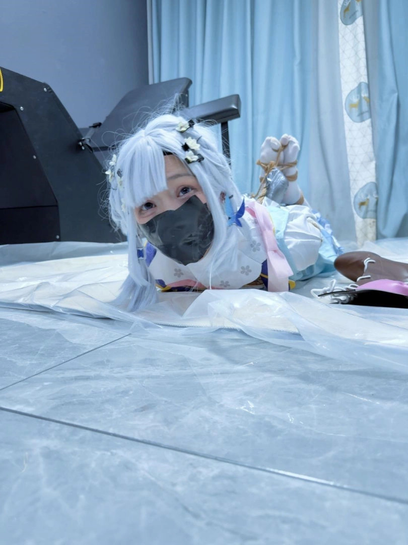 双手握拳,银色胶带包住小拳头,胶带包手~然后是一个经典的日式驷马,着重腿部拘束,膝盖、小腿、脚掌都用绳圈加固,值得一提的是高跟长靴也绕过脚掌绑上了绳子,并且把高跟鞋的鞋跟也绑在一起。