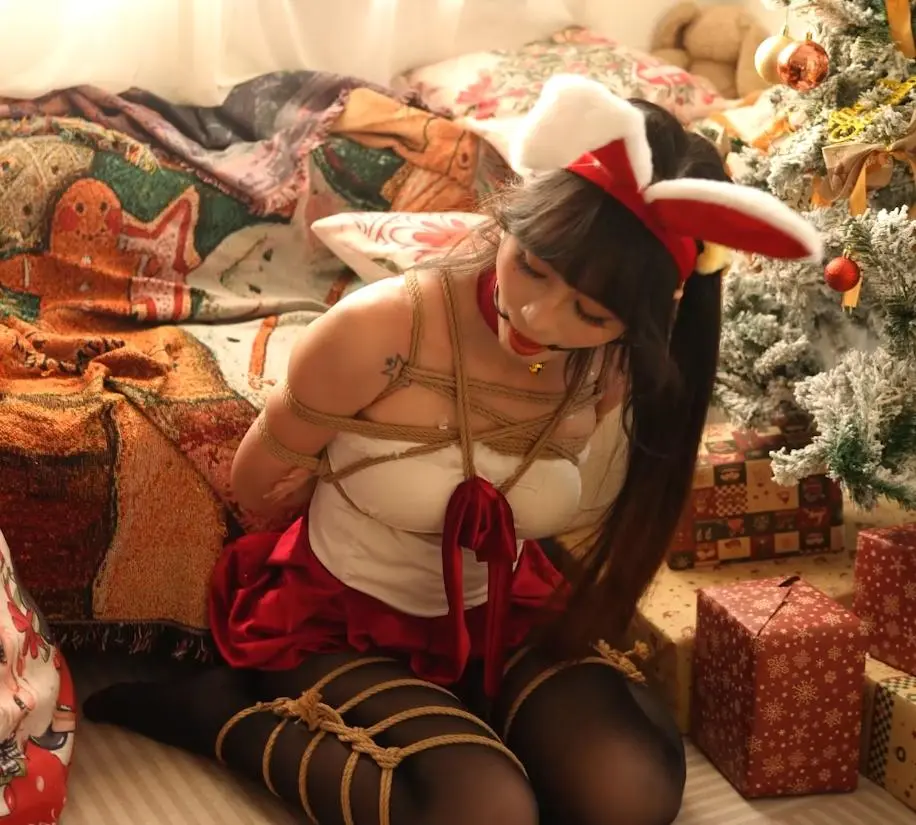 模特Mmi,圣诞写真,打开礼物盒,里面是用来捆绑的绳子。