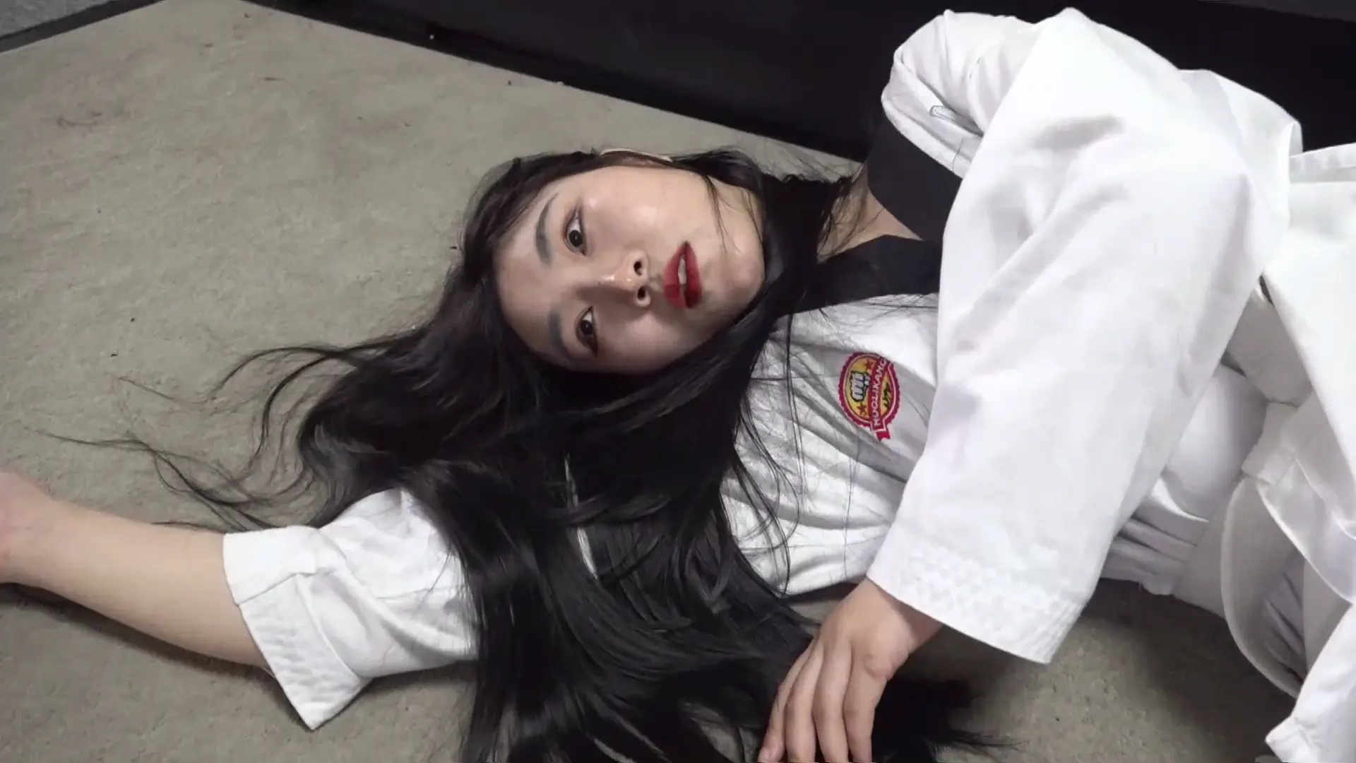 最后一幕,女主上身直立双腿跪在地上,两脚呈下图图示姿势,脚底露出来,两手比耶,面无表情,眼睛睁着,舌头吐出,像雕塑一样跪在屋子中间。镜头特写从女主脚开始向上一直到脸部(脚部和脸部停留时间可以稍长些,整个过程三分钟左右吧),最后给全身一个镜头然后逐渐拉远,结束。