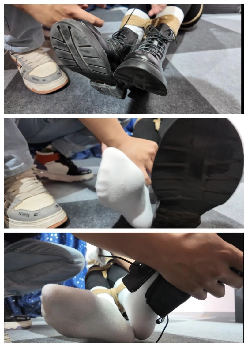 剧情介绍:接“不劳而获•大绑特绑(第二集)”,故事开始,两名坏蛋正在巢穴悠然自得的喝着茶聊着很龌蹉的话题,镜头一转,探清虚实的女保镖雨诺偷偷摸进了房间(剧情和第二集接上了,推荐大家从第一集开始看起)。进入房间的雨诺小心翼翼的摸着搜索情况,可她那里知道,她的一举一动都在坏蛋的监控下!镜头再次给到两坏蛋,口罩坏蛋看着雨诺的举动满脑子就想着快点去把她给解决了,而眼睛坏蛋坏点子比较多,提议让自己假装大声说话吸引美女雨诺注意,虽然让口罩坏蛋前去偷袭,要抓活的!一拍即合,二坏蛋就按照计划行动。此时雨诺被眼镜坏蛋大声说话的声音吸引,来到房间门口观察着,只观察屋内的情况,却没发觉有一只黑手已经向她靠近!摸到雨诺身后的口罩坏蛋不费吹灰之力就把雨诺制服,抓获!然后用枪顶着雨诺的头部,让雨诺高举双手像个俘虏一样往眼镜坏蛋处走去,来到眼镜坏蛋跟着,眼镜坏蛋说到:给我跪下!雨诺骂到:我才不跪你们这些混蛋呢!眼镜坏蛋见雨诺不知好歹,跟口罩坏蛋说到:让她跪下!口罩坏蛋立马上前往雨诺的膝盖处就是一脚!剧烈的疼痛要雨诺膝盖弯曲,让她只能跪下地上!虽然口罩坏蛋又说到:给我双手抱头!不然就一枪打死你!雨诺照做,然后眼镜坏蛋走上前,问她道:快说出你同伴的位置,我可以考虑放了你!雨诺说到:你做梦吧!我是怎样都不会说的!眼镜坏蛋说跟口罩坏蛋说到:别跟她废话了,先把她绑起来,我有办法收拾她。随后将绳子抛给口罩坏蛋,雨诺拼命挣扎,可不是两个坏蛋的对手,被两坏蛋制服并结结实实的捆绑起来!镜头一转,雨诺被捆绑在地上,眼镜坏蛋将一双袜子揉成团,然后口罩坏蛋一只手摁住了雨诺的头,一只手将雨诺的嘴巴捏开张到最大,然后眼镜坏蛋将袜子揉成一团往雨诺的嘴里塞!将雨诺嘴巴塞满后,又在雨诺嘴巴上封了三张红色胶带,被堵嘴加封嘴的雨诺只能呜呜呜的叫着,即便如此,眼镜坏蛋还觉得雨诺的“呜呜呜”声太大,于是拿来了黑色绷带,让口罩坏蛋扯住雨诺的头发,让她抬头,然后眼镜坏蛋用黑色绷带将雨诺嘴巴紧紧缠绕住!雨诺的呜呜呜声逐渐变小。(堵嘴封嘴过程有特写)捆绑堵嘴完后,两坏蛋觉得好久没得玩弄美女了,这送上门的一个可得好好玩玩!于是,口罩坏蛋解开了雨诺的鞋带,拉下拉链,把雨诺脚上的马丁靴脱了下来,露出一双厚棉白袜!(此处有脱鞋及棉白袜特写)露出白袜后,由口罩坏蛋负责雨诺脚心的挠痒痒,眼镜坏蛋负责挠雨诺腰上的痒痒!二人分工合作单单只是用手就把雨诺挠得受不了!随后二人觉得手还不够劲头,还用起了道具(电动牙刷,小齿轮,细铁丝)对着雨诺的脖子,腰子,脚心等敏感部位就是一顿挠!把雨诺折腾得呜呜呜呜并费力挣扎,可手脚被捆绑结实,嘴巴又被严密封堵的雨诺,除了呜呜呜叫和扭动身子外还能做些什么呢?在地上挠得不过瘾的两坏蛋又想了个损招,让雨诺跪下椅子上,然后接着挠她!