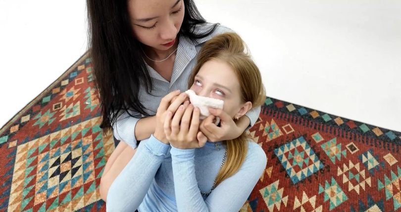 Ari (Asian) and Lizy knock each other out multiple times using chloroform while walking in high heels