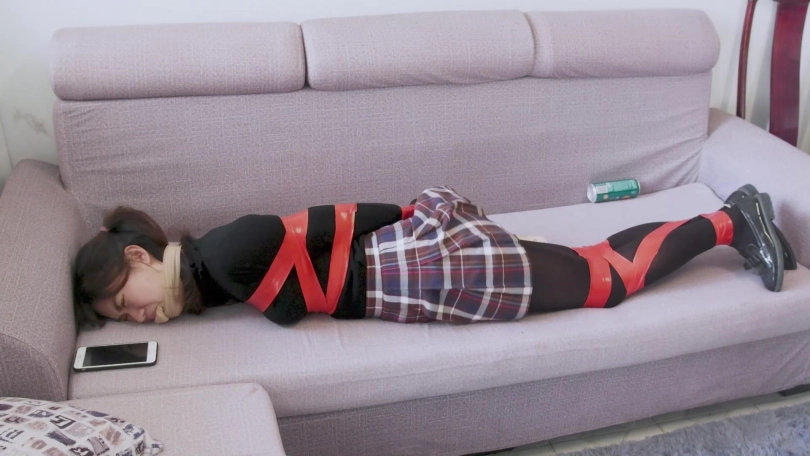 文莉找来一个胶带,把冬冬的手脚都用胶带给捆绑起来,然后拿起沙发上不知是自己的还是冬冬的一团丝袜塞